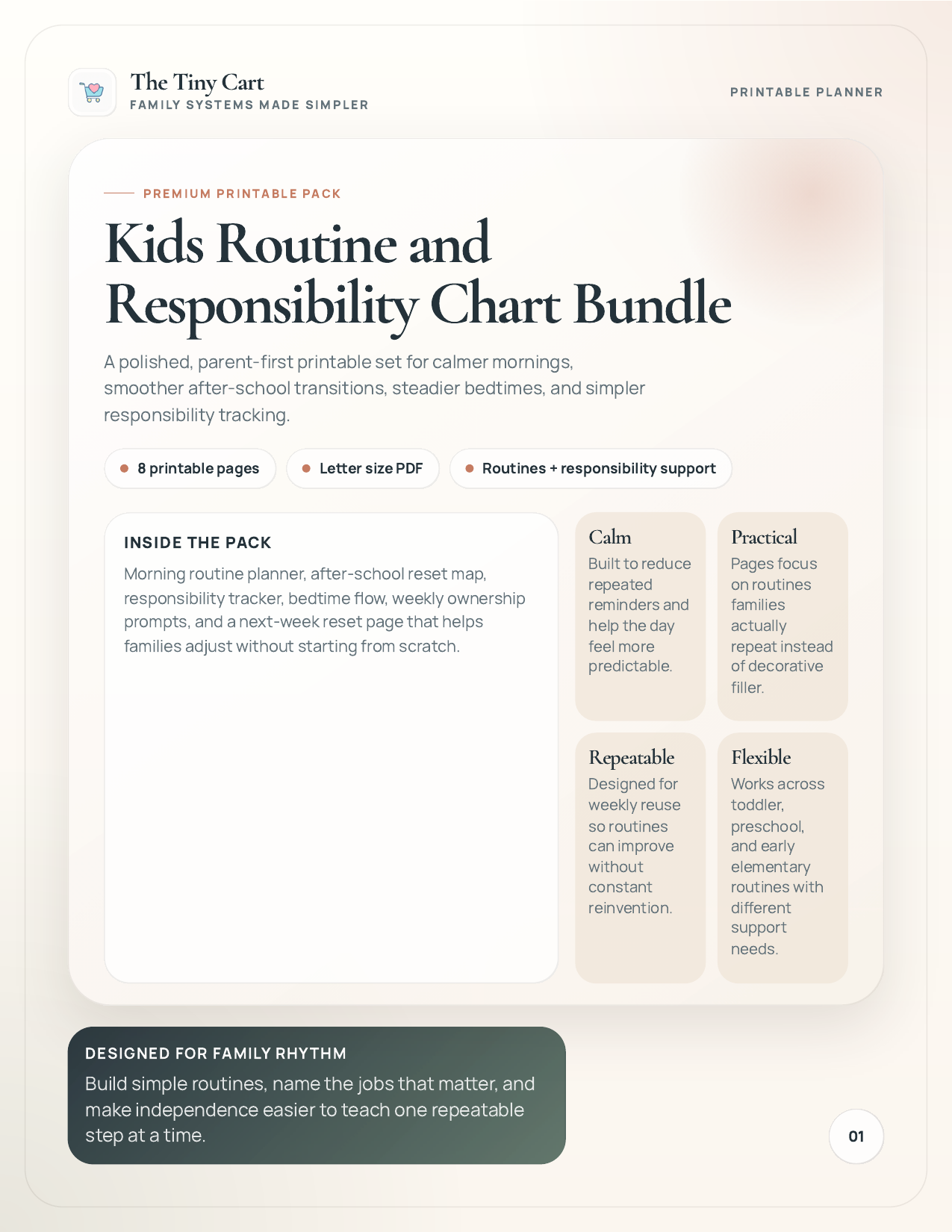 A calm printable bundle for families working on smoother mornings, cleaner after-school transitions, clearer expectations, and a bedtime flow that does not depend on constant reminders.